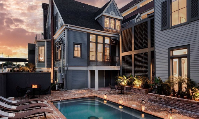 This unit inside a historic mansion in the Garden District can fit up to 16 guests with its 6 bedrooms and 4 bathrooms. With its modern amenities, including a shared outdoor space with a heated pool, tropical spa, outdoor kitchen, and more. This unit is perfect for those wanting to be in the middle of New Orleans. The professionally designed spaces offer open-concept layouts and kitchen & dining spaces perfect for entertaining.