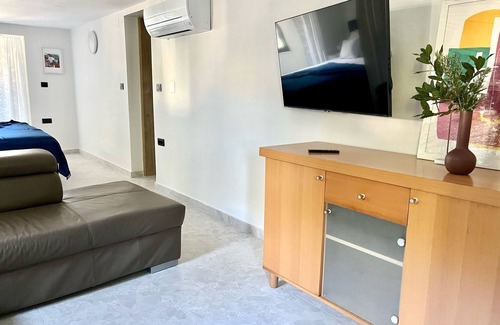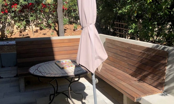 Enter to this beautiful, fully renovated, garden studio apartment through a private terrace with garden. Inside find one large room divided by a curtain into bedroom with a king size bed and a living room with sofa bed and flat screen tv, one bathroom and eat in kitchen. The room has an air conditioning. Park your car in the parking lot inside our fence and walk to one of many beaches that are only 100m away.