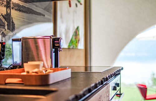 "Garden Suite", 2-room apartment 40 m2, on the ground floor, south-east facing position. Spacious and bright, fully renovated in 2022, luxurious and tasteful furnishings: small living/dining room with panoramic window with dining table. Exit to the terrace, to the patio. 1 double bedroom with panoramic window with 1 double bed (2 x 80 cm, length 200 cm). Exit to the terrace, to the patio. Small, open kitchen (oven, dishwasher, 4 ceramic glass hob hotplates, toaster, kettle, electric coffee machine, Capsules for coffee machine (Nespresso) free). Shower/WC. Underfloor heating. Large terrace, south-west facing position, large patio partly roofed. Terrace furniture, barbecue, deck chairs (2). Marvellous panoramic view of the lake, the mountains and the countryside. Facilities: hair dryer. Internet (DSL/LAN, free). Please note: not suitable for children under 14 years. Non-smokers only. Private entrance. The “cozy” garden suite invites you to linger and unwind. Treat yourself to a soothing break high above Lake Maggiore! NL-00012626