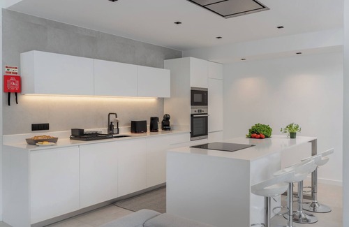 The social area follows an open-plan concept, with a spacious living room and a fully equipped kitchen — ideal for relaxing moments and shared meals. A laundry room adds extra practicality for longer stays.