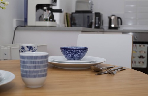 The space includes under-floor heating, a fully equipped kitchen with dining table for two, electric hob & oven, fridge, microwave, Dualit coffee machine and toaster.
