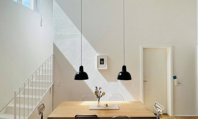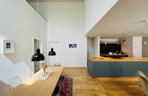 The heart of the home is a 50 m² open-plan living loft featuring a designer kitchen, iconic furniture pieces (Eames, Vitra, Eiermann), and direct access to the furnished terrace and private garden. Two bedrooms and one bathroom with bathtub are located on the ground floor. An open staircase leads up to the gallery level with an additional bedroom and en-suite bathroom (with both bathtub and separate shower).