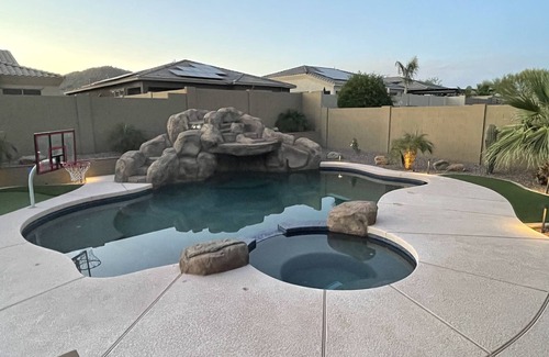 Fully furnished, 4 bedroom, 3 bath vacation home in private, gated community in Golf Canyon neighborhood in Estrella Mountain Ranch. Greatroom invites guests to oversized covered patio through the 12' sliding glass doors to view the backyard Oasis with plenty of seating for backyard bbq. Never worry about propane as grill connected to gas. Heated pool and spa complete with waterfall grotto, waterslide, and pool toys. For those competitive vacationers, enjoy a game of poolside basketball or putt-putt on the backyard putting green. WiFi and premium cable/movie channels which can be viewed in each bedroom, living area and outdoor TV. Master suite includes soaking tub and spa-like shower. King size bed in Master, queen size beds in en-suite, as well as the additional two bedrooms.
