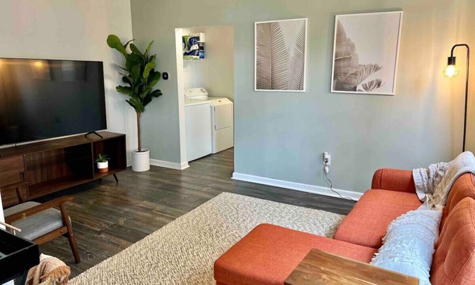 Large 1 Bedroom unit. Living area has ample seating and a smart TV. Kitchen is fully equipped with everything you need. Dinning space for 4. In unit washer and dryer. Large bedroom with queen bed, dresser and smart TV. Bathroom with tub and shower. All linens and starter toiletries provided.