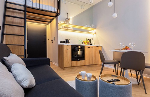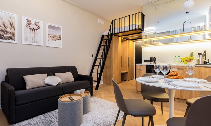 Gdańsk Coastal Escape Apartment #7 is a stylishly designed apartment offering a comfortable space perfect for a relaxing stay in Gdańsk. It features a living room with a sofa bed and a mezzanine with a comfortable mattress, a kitchenette, a bathroom, and a terrace where guests can unwind with a morning coffee or an evening glass of wine. The apartment is equipped with a range of practical amenities, including free Wi-Fi, cable TV, iron, hair dryer, fridge with freezer, dishwasher, induction hob, oven, kettle, and kitchen accessories.