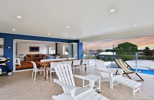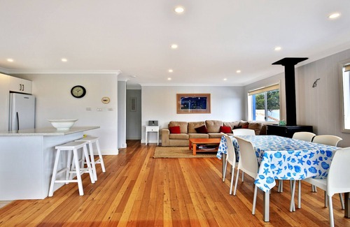 Stunning ocean views. This house is perfect all year round with log fire to enjoy in winter. It has been completely renovated including two new bathrooms (with separate bath and shower) and kitchen.There is a queen bedroom upstairs. Downstairs there is a second queen room, one double room and a bunk room with four bunks . One bathroom is upstairs and one downstairs. There are two separate lounge rooms, one upstairs and one downstairs with TV/DVD. There is a 10 seater table on the balconly with BBQ. The kitchen is very well equipped with dishwasher, microwave and more than enough crockery, cookware, serving dishes etc. A real home from home. There are bi-fold doors both up and downstairs which open right up - all doors and windows are fitted with mosquito screens. There is also an outdoor hot/cold shower. Linen and towels can be provided by prior arrangement.