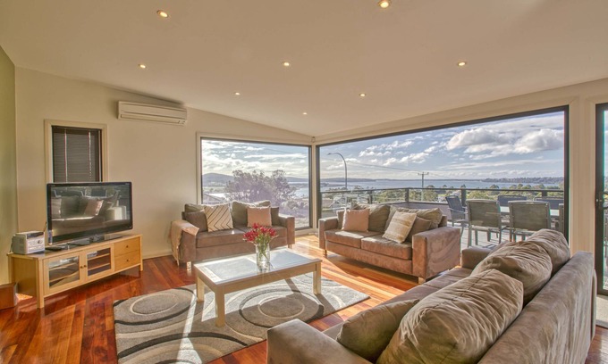 Large and luxurious this house is an ideal getaway for large groups and families. With two living areas and clever forethought of the floor design, there are areas where each person can take advantage of the space and privacy. A large lounge area with the kitchen and dining room with sliding doors opening out onto the deck for great outdoor entertaining where you can fully appreciate the extensive water views.