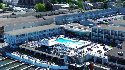 Located in Lake George Village, The Georgian Lakeside Resort has 158 rooms and suites featuring 350 feet of lakefront with a private beach, lakefront Cabana Bar with dining, heated pool, fire pits, watercraft rentals and boat dock space for registered guests. During peak season, enjoy a delicious fresh breakfast and gourmet coffees at our Galley Cafe. All rooms are equipped with cable TV, refrigerator, coffee maker, microwave, hair dryer, iron, ironing board and free WIFI. Parking for registered guests is also free (one vehicle per room). Our Courtyard rooms do not have a view of the lake but are nicely appointed and offer guests an affordable option steps away from all the amenities on the property. Poolside rooms are in the center of the property, close to the pool, the Cabana bar and the outside dining. These rooms do have a view of the lake to the right. Lakefront rooms are located on the lakefront with a beautiful view of the lake and feature a private patio with lounge furniture. Lake view Suites are a great choice for travelers needing more space. These rooms are larger than a standard room, have two king beds, a living area with a sleeper sofa, and a sliding glass door that leads to a private balcony overlooking the pool and the lake.