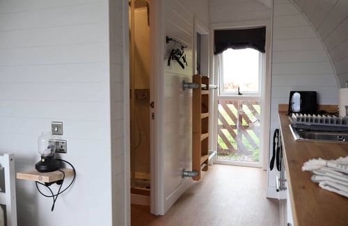 Enjoy beautiful views and access to Scarborough and Whitby in this adorable modern glamping cabin. Gertie is equipped with a King bed and two in-built bunk beds in an open plan accommodation. She benefits from a full kitchen with a 2-ring hob, oven, fridge, and dishwasher (all compact in size).