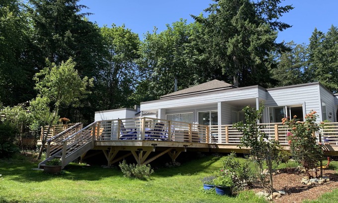 This executive style rental home of 2,000 sqft on 2.6 acres, recently renovated, surprises with lots of space and 100% privacy, lots of daylight from sky lights and large windows - but still is a cosy place for everybody in your group. The 2 main bathrooms just new or renovated in April 2022. A brand new kitchen with top notch appliances was installed in January 2023. You'll be amazed about the quietness and peacefulness of the surroundings! You'll experience a bright, architecturally unique home with a 1,300 sqft deck with ocean view, fully equipped kitchen and large living area. This home sleeps up to six adults.