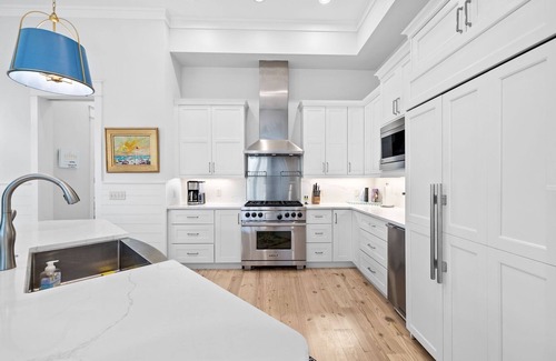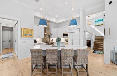 DETAILS: Nothing says "family vacation" like a great place to gather, and this home's open-concept main level is the perfect place. Transom windows and French doors allow natural light to fill the space, creating a warm and inviting ambiance. Bright white cabinetry and white countertops make this airy kitchen a home cook's dream. This area features a large center island, premium stainless steel appliances, and a gas range - everything you need to prepare a fresh, coastal meal. The nearby dining table provides seating for 10 guests, and 4 additional seats are available at the breakfast bar. After a long day of fun in the sun, plush furnishings invite guests to sit back, relax, and enjoy time together in the living room. Guests in the stunning primary bedroom will love the luxurious king bed, a large flat-screen television, and private bathroom which offers a glass-front shower, a spa tub, and a spacious dual-sink vanity.