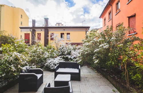 Finely furnished open space located on the first floor of a typical Bolognese building in the heart of the historic center, less than ten minutes walking from Piazza Maggiore. The apartment has an equipped open plan fully equipped kitchen, table, TV, double bed, single sofa bed and bathroom and washing machine. It boasts a large private terrace.