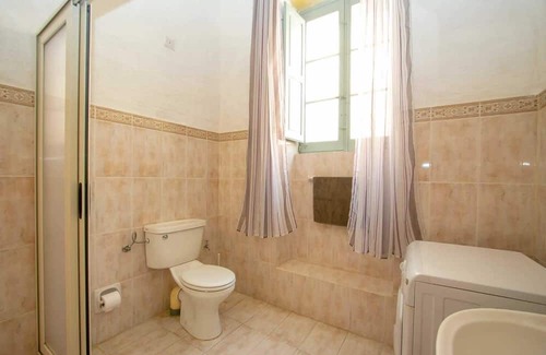 This spacious, airy apartment is all on one floor. Steps up from the hall lead into a very large living room and dining area with the kitchen leading off it. It has a lovely stone fireplace with wood burning stove and a piano! A fabulous room for entertaining or relaxing. Off the entrance hall are a twin and a double bedroom, each with its own shower/bathroom. A large terrace wraps around the side of the house, past the double bedroom, and continues on around to the living room and kitchen areas.
