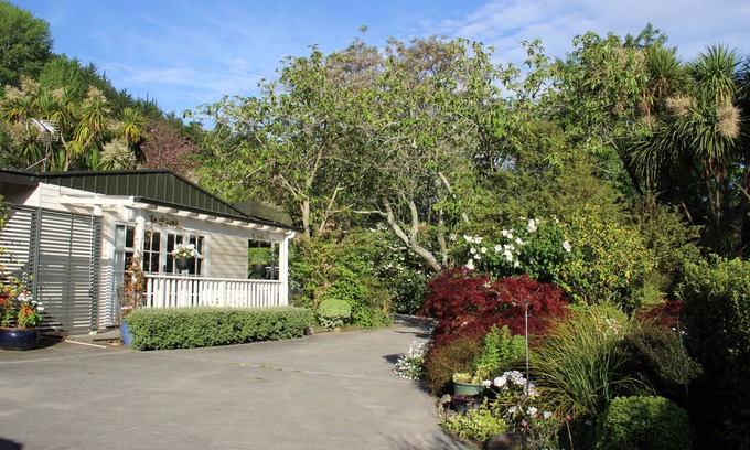 The guest house is located on a lifestyle block at 142 Valley Road. The farm has sheep, chickens and working dogs.