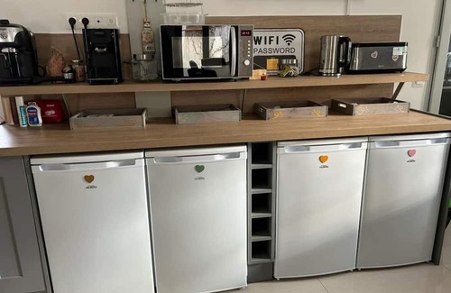 Large living room with equipped kitchen and lounge available in a common area (fridge and private storage space for each suite). 127cm TV with Netflix.