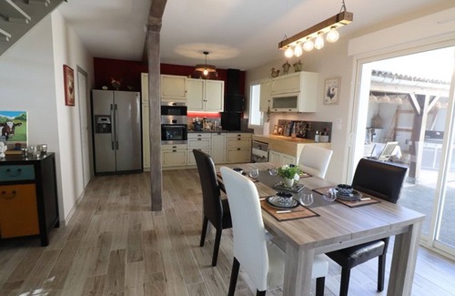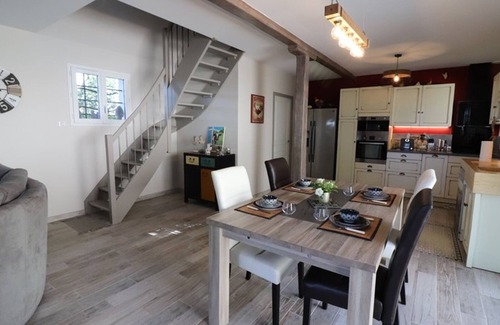 You will have an unfenced plot of 2000m² with private swimming pool, a pétanque court, a covered terrace with garden furniture, barbecue, plancha, deckchairs and a ping-pong table. On the ground floor, the house is equipped with a fitted kitchen area, a living room with flat screen TV and pellet stove (€8 per bag), a separate toilet with laundry area. Upstairs, 1 bedroom with 1 160X200 bed, flat screen TV and balcony, 1 bedroom with 2 single beds that can be converted into 1 180X190 bed (beds made on arrival) and flat screen TV, shower room with toilet (bath linen provided). The cottage is equipped with an internet connection: repeaters have been installed to broadcast the wifi inside the house and throughout the exterior. Electric heating with reversible air conditioning included in the rental price. Rates all charges included except pellets. Holiday insurance certificate to be given to the owner on arrival.