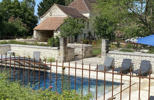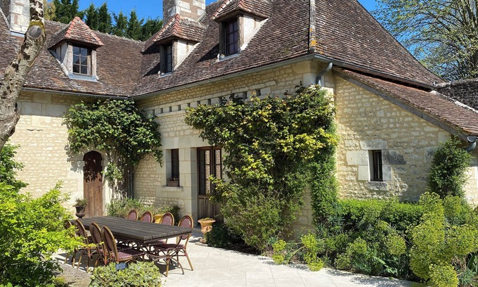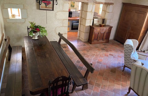 Set by the natural park of the LOIRE VALLEY, ideally positioned for exploring the Chateaux and vine yard : CHINON, SAUMUR, LOCHES. Authentic French 16th century manor LA COQUETIERE in PORTS sur VIENNE overlooking the Vienne river, surrounding by 5 acres of a dreamy garden with thousand of roses, trees, and fruit trees. No neigh-bour around, very quiet and peaceful. Magnificent tiles covered and Sun heated swimming pool (no chimical syteme) 5x10 Meters with spa and sunny terraces enclose by stone walls, 2 security system very safe for your children. Fishing, canoeing, riding, restaurant and are 5 minutes away in the valley. The LOGIS is composed of a large lounge with authentic fireplace, imposing beams, fully fitted kitchen: oven, fridge, dishwasher, microwave, crockery, coffee machine. Utility room with washing machine, upstairs 4 bedrooms, equally stylish, 3 with double beds, 1 with 4 single beds ideal for children, 2 shower rooms, 1 bathroom, 2 toilets. The property has been made safe and well equipped to make a family holiday as relaxing and enjoyable as possible. The hilly and protected countryside offers beautiful walks to discover wild animals, plants such as fields of orchids. An open barn offer a very safe game area for children, it is full of toys. The covered swimming pool enclosed by stone walls is very safe, there is 4 large steps to come in with spa, It is exclusive use for our guest. The owners are delightful, happy to tell you about walks, bike trails, riding (stables nearby), markets and summer festival. The place is classified 3 stars by the tourism authority.