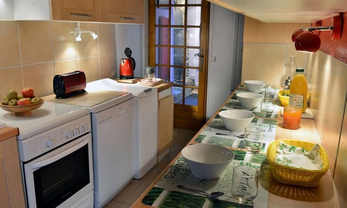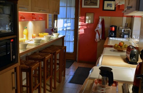 On the ground floor, fitted kitchen area, 1 bedroom with 1 double bed and its private shower room with wc, large separate shower room (jet shower) with wc. On the 1st floor, spacious living room with stove (free wood), 1 bedroom with 1 160x200 bed, 1 sleeping area with 2 single beds. On the mezzanine relaxation area with flat screen TV, DVD player and hi-fi system. Wifi internet access with telephone. Beds made on arrival, bathrobes and household linen provided. Libraries. Electric heating included. Prices all charges included.
