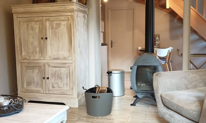 Open-plan equipped kitchen (multi-function oven, microwave, dishwasher, refrigerator with freezer compartment, SENSEO pod coffee machine), wood stove (wood extra, see with the owner), living room with flat screen TV. Shower room (walk-in shower, WC separated by a sliding door).