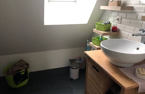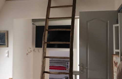 On the ground floor, a large fully equipped kitchen with wood stove. Large bright veranda. 1 bedroom with 1 double bed and 1 cot. 1 disabled-accessible shower room with WC (booster chair available).