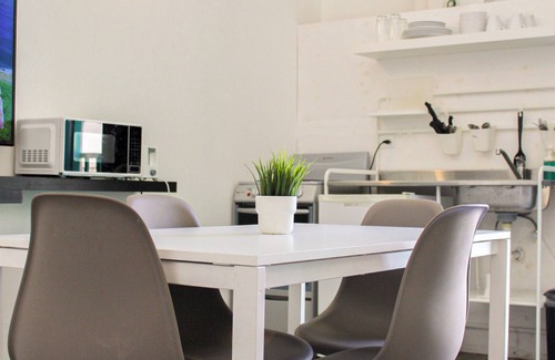En su cocina se incluye: fregadero, estufa, nevera, microondas, cafetera, vajillas, cubiertos, utensilios de cocina, vasos y copas, productos de limpieza, ollas y mesa.