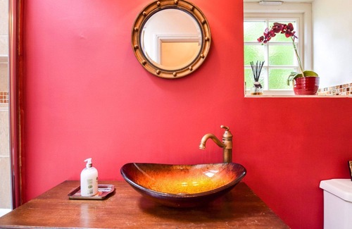 This bright and light bathroom has richly coloured deep magenta walls and features a full-size bath with an overhead shower, a stunning golden lacquered sink set in an antique dressing table, a toilet and a heated towel rail. (This Bathroom serves as the En-suite to Bedroom 4).