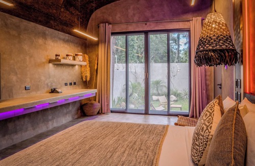 The stunning open-air living/kitchen/dinning space - wrapped within an Earthen roof - seamlessly blends into your private tropical pool garden.