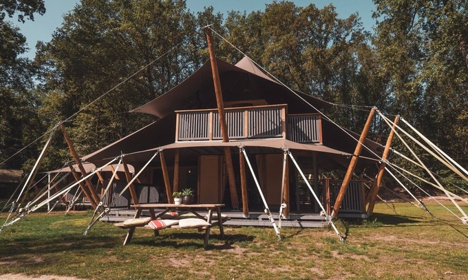 Glamping 8-person Safari tent is located in Uden. Glamping 8-person Safari tent provides accommodation, featuring Hot Tub, Internet, Kitchen, among other amenities. This House features Hot Tub, Internet, Kitchen, to make your stay a comfortable one.