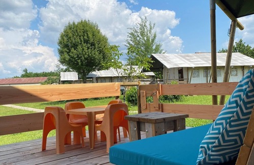 The Safari tents, with their spacious wooden terraces, allow you to enjoy luxury while immersed in nature. The site features a swimming pool, a large open barn, and plenty of shaded picnic areas for relaxing.