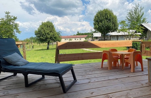 The Safari tents, with their spacious wooden terraces, allow you to enjoy luxury while immersed in nature. The site features a swimming pool, a large open barn, and plenty of shaded picnic areas for relaxing.