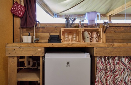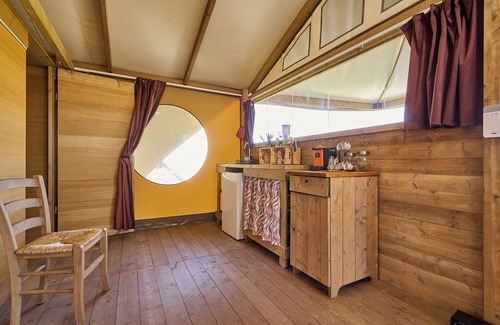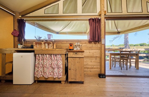 The glamping "Tenda Glamping Vicino Al Mare" in Piombino is the perfect accommodation for a stress-free holiday with your loved ones. The 35 m² property consists of a living room with a sofa bed for 1 person, a well-equipped kitchen, 1 bedroom, and 1 bathroom and can therefore accommodate 3 people. Additional amenities include Wi-Fi as well as a fan.