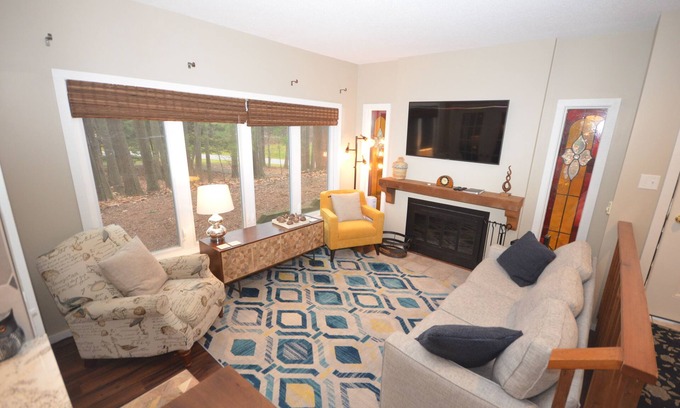 This charming condo, situated amidst the woodland at The Homestead, is an excellent small getaway to experience everything in Glen Arbor. It features one bedroom and one bathroom and can accommodate up to four guests with the addition of a sleeper sofa. The condo is accessible via a wooded walkway. There are about three stairs at the start of the walkway and three to get into the condo.