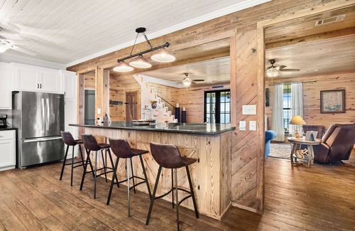 Welcome to Glen Oaks Lakeside Lodge, a rustic yet modern retreat perfect for large families. This charming lake home comfortably sleeps 12 to 14 guests, offering ample space and comfort.