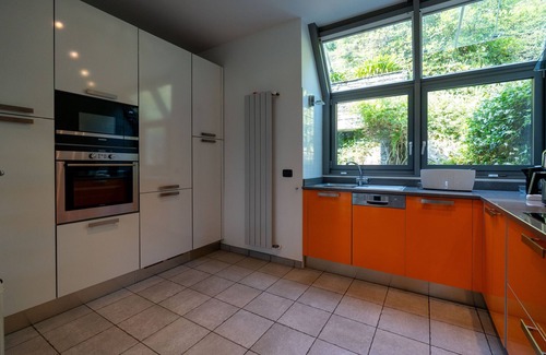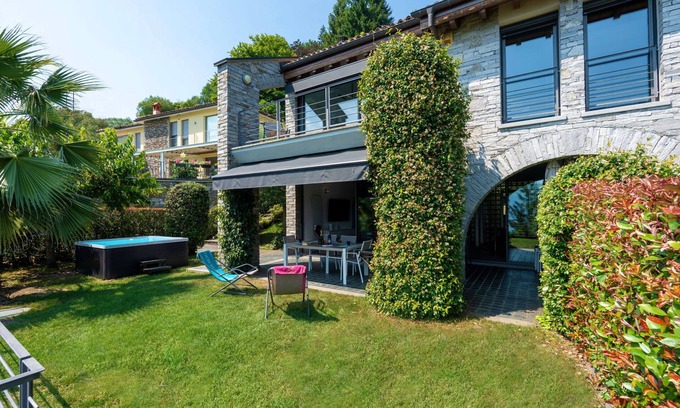 On the panoramic and sunny hillside in Verbania Suna is the Archi House & Spa: a modern semi-detached stone villa. The house furnished in modern style has large windows from which you can enjoy the view of the Borromeo Gulf. The large living room with lounge, TV and dining area overlooks the covered porch equipped with dining table, barbecue and awning. In front of the porch there is a small well-kept garden with beautiful palm trees and also the brand new large 5-seater heated Jacuzzi tub. The ground floor competes with a large, well-equipped kitchen and a service bathroom, without shower. A designer metal staircase leads to the first floor where there are two double bedrooms, one with lake view and one with garden view, and a bathroom with bathtub, also with garden view. In addition, there is the bright master suite with a double bed and a large terrace with lake view. This room has an en suite bathroom with shower. Behind the house there is a garden with many plants that goes up the hill. At the highest part of the garden there is a flat sunbathing area with sunshades and deck chairs, from which there is an enchanting view of the Borromeo Gulf and the islands. Below the house in the basement there is a bright suite to accommodate two extra guests with a bathroom where a modern sauna is available for guests. Two parking spaces are available, one covered and one inside a single garage . In 5 minutes you could reach the centre and the lakefront by car or 15 / 20 minutes on foot . This modern villa has all comforts and is ideal for a relaxing holiday enjoying the view, the garden and amenities such as Jacuzzi and Sauna. Small dogs are allowed for a fee.