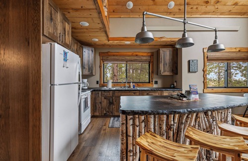 Inside the cabin, you will find natural finishings, large, exposed beams, and a cozy fireplace. There are 3 bedrooms and 2 full baths that sleep a total of 12. Downstairs there are 2 queen bedrooms. The master suite has an en suite bathroom attached while the other bedroom is adjacent to the second bathroom. Upstairs in the loft, you will find 2 sets of bunk beds with queen-sized beds. Additionally, the loft has a foosball table, pub table and chairs, and toys for the kids. The kitchen comes stocked with all things needed for cooking at home. Plenty of parking for multiple cars and overflow parking for trailers is available. Options for a RV campsite including full hook-ups with power & water readily accessible are also available at request.