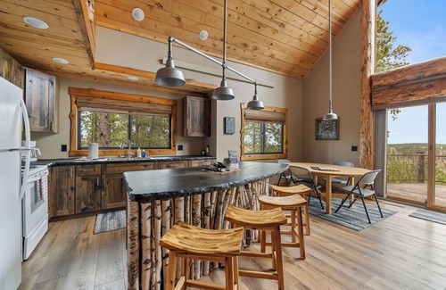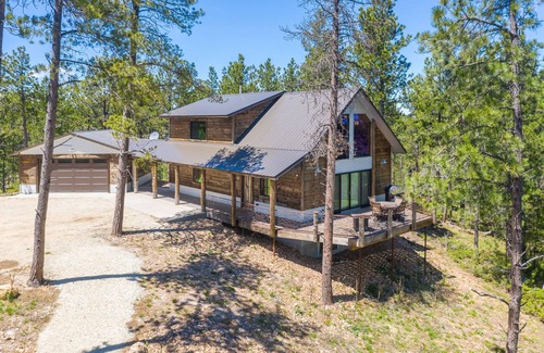 The Gold Nugget Lodge is a unique blend of seclusion and convenience that makes it a true gem. Surrounded by the Black Hills Forest, the Gold Nugget has no visible neighbors while being less than 6.5 miles to Deadwood and 8.5 miles to Terry Peak skiing. This cabin features a large deck and floor-to-ceiling windows facing east to watch the sunrise over miles of the Black Hills. Enjoy the nights next to the outdoor fire table, under a blanket of stars unobscured by city lights.