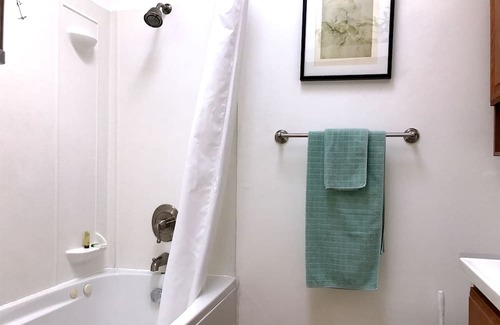 The main bathroom has skylight with full bath / shower / jacuzzi and space to store your toiletries. The large bedroom has a private bathroom with shower.