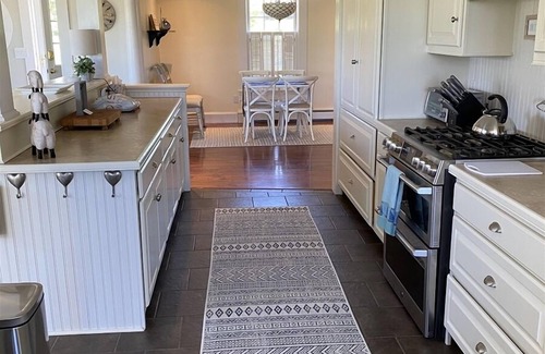 As you enter the home, you will be in the large, deluxe kitchen equipped with all new appliances and amenities to cook up a feast. Folks can sit at the counter or in the comfortable chairs to converse with those preparing and/or sit at the dining table to play cards. Around the corner is the living room set up with ample seating and a new, large, flat screen Smart TV for an evening movie and a convenient laundry room. On the other side of the living room is a new king bedroom with ensuite full bathroom and TV, and full bedroom on the other side of the staircase. There is a new half bath near the entry of the house.