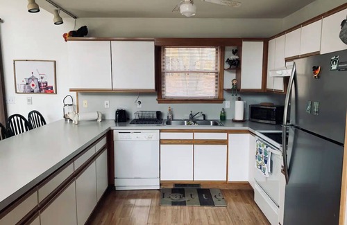 The living room is lit by natural light all day long and includes a Brand New 58” smart TV that has Netflix. The large kitchen is connected to the living room through an open floor plan. The kitchen is fully stocked with all that you will need for your stay! Utensils and kitchen gadgets such as a microwave, blender, coffee machine, k-cup machine, etc will all be available during your stay. The dining table fits 8 but there is a folding table available when needed to fit 10. There are also 6 seats at the breakfast bar for those moments when a sit-down meal takes too long. Two cozy bedrooms are on the first floor, each bedroom has a full bed and a single fold out couch. Each bedroom is filled with towels, pillows, blankets and fresh linens! The bathroom on the first floor is fully stocked with toilet paper, towels, soap, shampoo and conditioner. The first aid kit is located in this bathroom.