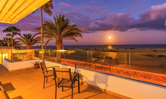 Beautiful Golden Sahara sits within the Playa del Ingles area of Maspalomas. Famous for its huge sand dunes, sandy beaches and attractive nightlife, Maspalomas is a must-see for those looking for adventure. The stunning sand dunes are a sight to see and Golden Sahara offers the most spectacular view of these protected sandy attractions. This gorgeous villa boasts a panoramic rooftop, with cosy sofas and sea views as far as the eye can see, creating a sunny haven for morning coffees and sunset nightcaps. The enclosed terrace is surrounded by a volcanic stone wall and towering palm trees, whilst taking centre stage is the 7.5x3.5m heated* pool. There's also a wrap-around garden and alfresco dining with a portable BBQ, ideal for a light lunch as you plan your afternoon ahead.