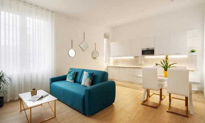 This beautifully designed, contemporary Villetta boasts a spacious, elegant feel from its high ceilings and tall windows. Luxurious and lavish decorative touches of gold and tea bring grandeur with all the comforts. This gorgeous Villeta has all the kitchen and laundry amenities, WiFi, heating, and air conditioning to offer a relaxing stay for couples, friends, or families. Being only a 5 minute walk from the town square and centre, it offers the most splendid, idyllic city break.