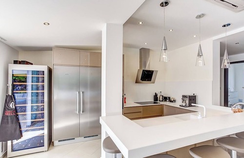 Once inside the property you enter a generous sized hallway and split level, open plan living area. There are two seating areas, a dining area and kitchen with breakfast bar. The kitchen is fitted with high quality appliances including large wine fridge, an American style fridge freezer, microwave, oven and induction hob and dishwasher. There is a large flat screen television with blue-ray, dvd and playstation 4 in the living area. Patio doors give access to the extensive terrace area and infinity pool.