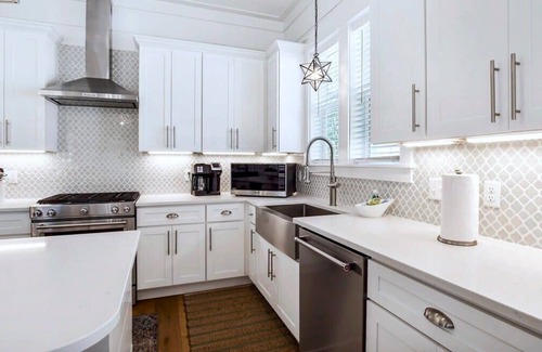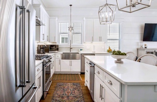 The perfect kitchen for entertaining! Our fully appointed chef’s kitchen boasts tons of countertop space, a 4-seat island, and dining space for your whole party. Best use - setting up your own shrimp and oyster bar with takeout from Buddy’s Seafood (1 min / 0.5 miles away)