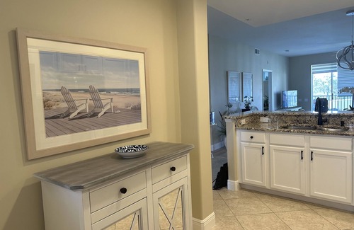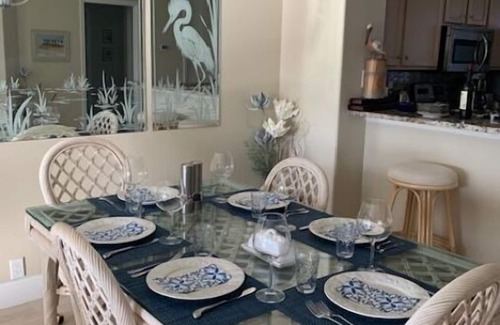 This 2 Bedroom, 2 Bathroom condo has all the amenities to make your stay enjoyable. The kitchen with breakfast nook has marble countertops, stainless steel appliances and is fully stocked for your entertaining/cooking pleasure. The master bedroom and 2nd bedroom both have king beds with memory foam toppers, smart TV’s and all bedding/towels are available to you. The spacious living-dining room area opens onto the beautiful lanai with views of the 14th green and amazing sunsets. New lighting throughout.