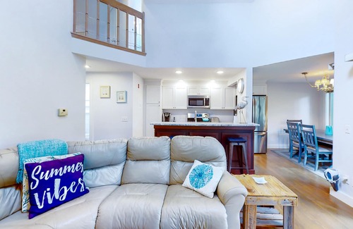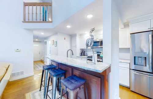 This two-story townhome is tucked into a leafy grove, with views of the golf course filtering through the trees. It's a lovely location for a summer on Cape Cod, with South Cape Beach State Park (two miles), the Cape Cod Children's Museum (three miles), and Mashpee Commons (five miles) all within a short drive.