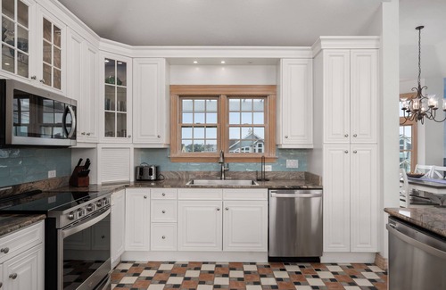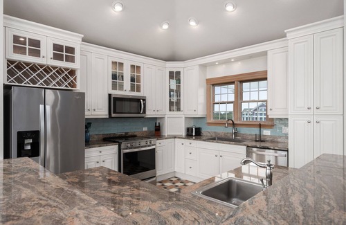 The top-level great room is spacious with high ceilings and ocean views from any angle and offers comfortable seating for TV viewing, an updated kitchen with island seating, 2 dishwashers and dining table and nook for family-style dining. The master bedroom is fully equipped with a king-sized bed and a large private bathroom with ocean views throughout. On the mid-level, each bedroom has its own bathroom and deck access, allowing every guest their own private area of the home, while the ground level offers fun for all ages with an arcade game and plenty of seating for those rainy day-movie marathons. The home offers use of the 2-car garage and has a full-sized fridge for your convenience and extra storage space for snacks and drinks to enjoy poolside.
