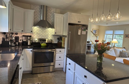 The 1500 sq. ft. house features a beautifully appointed living room, open kitchen with spacious island, dining room, and 1/2 bath on the first floor. There are 3 bedrooms (master king with en suite toilet/shower, queen, and a bedroom with two twins) on the second floor. There is also a full bathroom, and a bathroom with shower only (king en suite) on this floor. Hot water is on-demand. Heating is radiant through floors on the first floor and baseboard upstairs. Ceiling fans in king and queen bedrooms, floor fan in twin provide cooling.