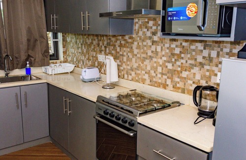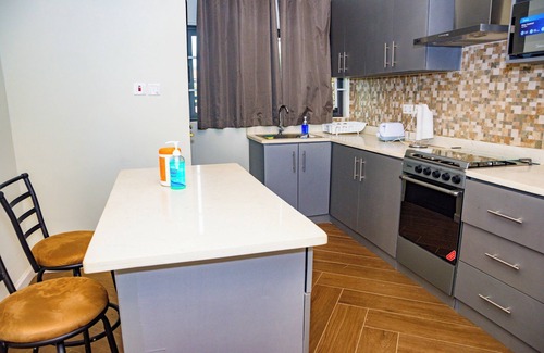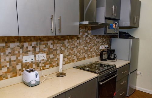 The modern IKE Apartment Homes are located on a secure and gated compound manned by 24/7 private security. The IKE property consists of four (4) fully furnished air-conditioned apartment homes. Each IKE apartment home has two (2) ensuite bedrooms with queen size beds, a fully equipped kitchen and island to prepare and eat meals, a separate dining area, as well as a living room with sofa and cable TV. Each apartment home also offers a half bath, Wi-Fi, a patio and intercom phones to communicate within the compound, a separate laundry room with washing machine, access to clothes drying line, an iron and ironing board. Each apartment home can accommodate up to four (4) guests.