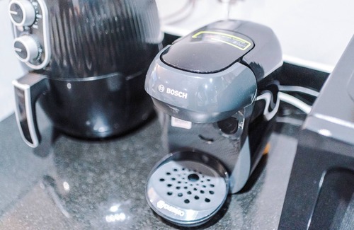 The kitchen is fully equipped with all the necessary cooking equipment including air fryer, coffee machine, dishwasher, cutleries and utensils.