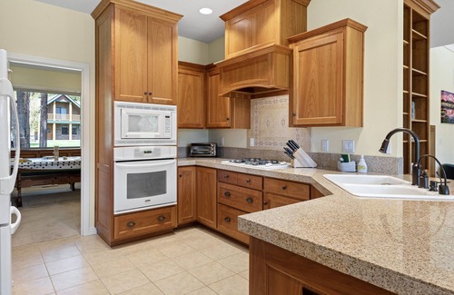 Kitchen - Prepare meals effortlessly in the open and sunlit kitchen, equipped with everything you need and more. This fully stocked kitchen ensures convenience at your fingertips, providing all the essential tools and amenities. Ample counter space invites socializing with the cook, with room for four comfortable bar stools. Plus, savor the delightful river view as you engage in the culinary experience.